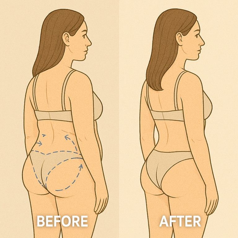 This 36-year-old patient wanted to enhance the shape and fullness of her buttocks while improving overall body balance. She underwent a Brazilian Butt Lift, which involved liposuction to remove excess fat from the abdomen and flanks, followed by fat transfer to the buttocks. The result is a more contoured waistline and a fuller, lifted appearance that complements her natural figure.